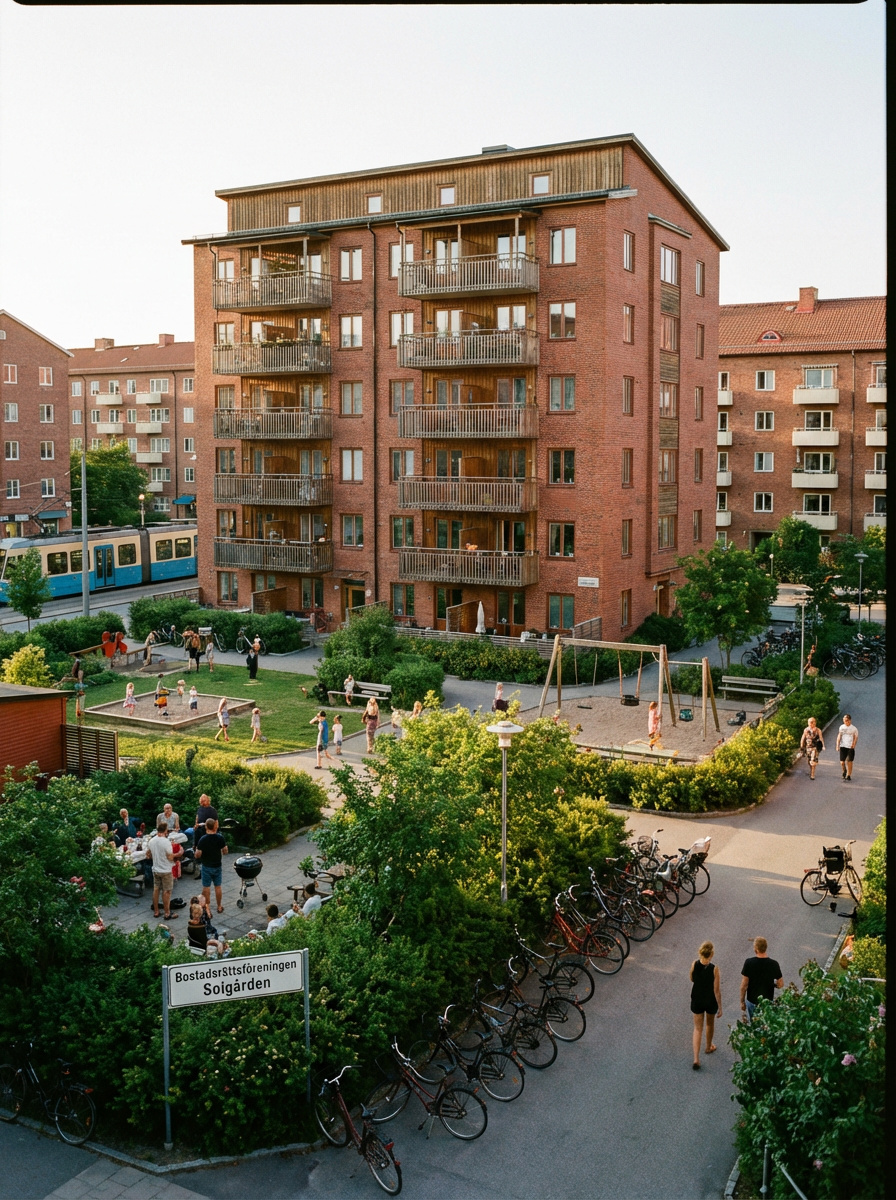 Fastigheten omges av gröna gårdsmiljöer med lekplats och gemensamma ytor som skapar trivsel och gemenskap i området.